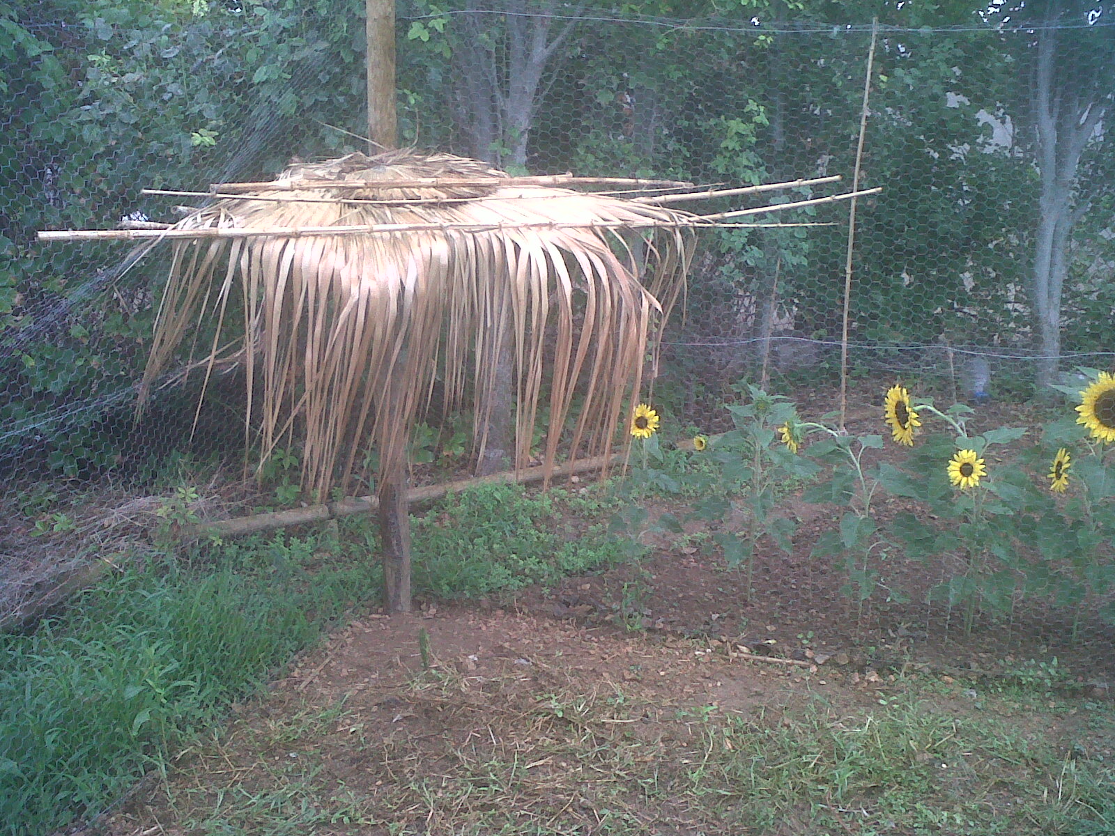 Shaded area under a palm frond and bamboo sticks. When the sun shines it gives a little extra shade.